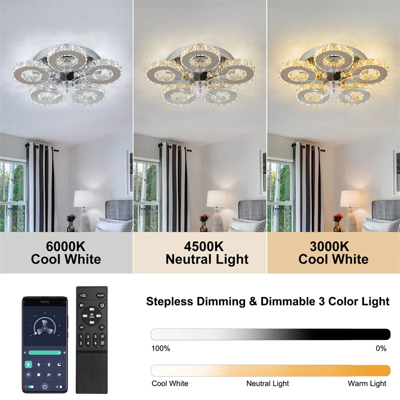 Configure a dimmable remote control and download an app on your phone to adjust lighting, wind speed, and a high-tech new lifestyle.