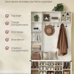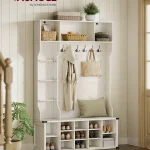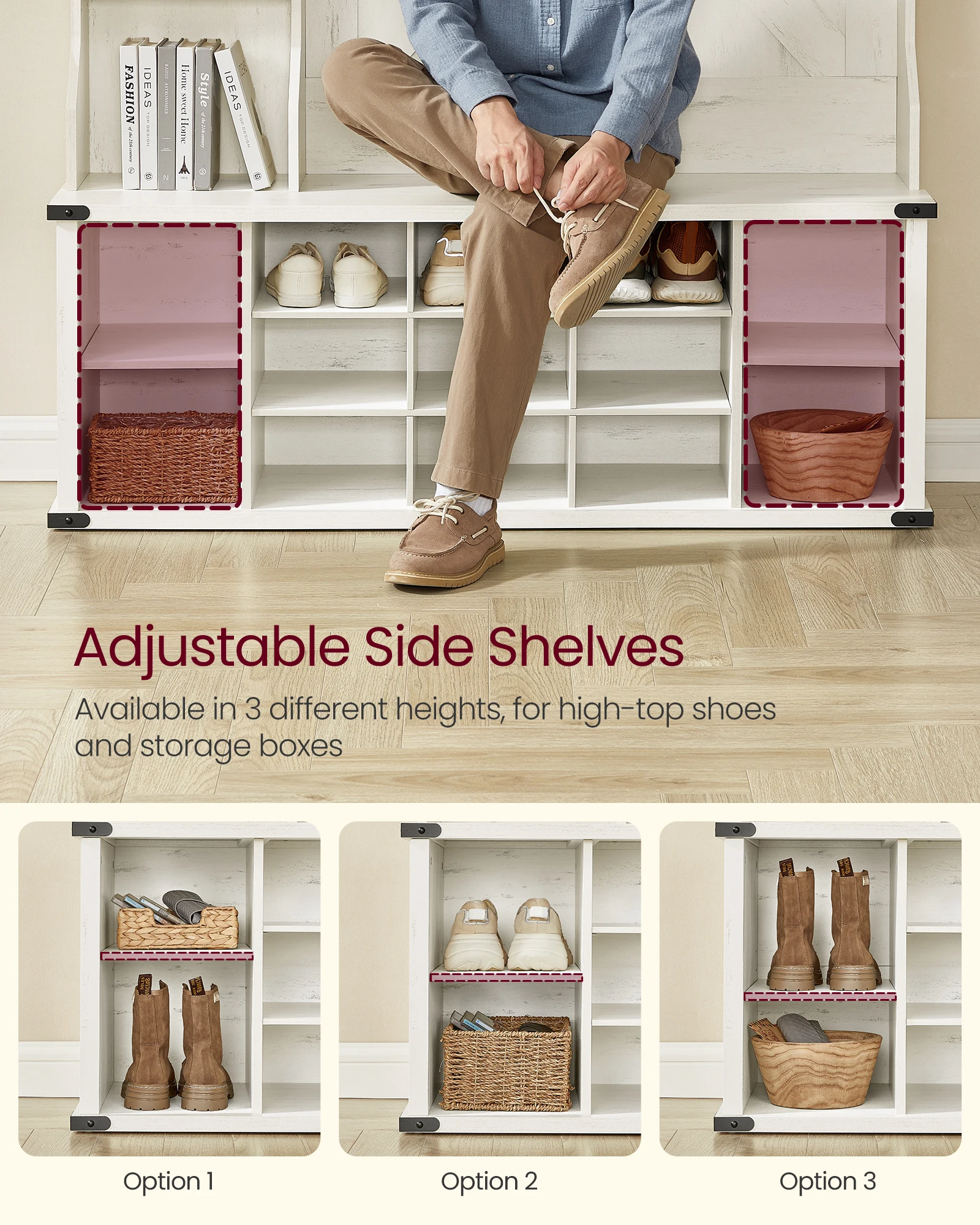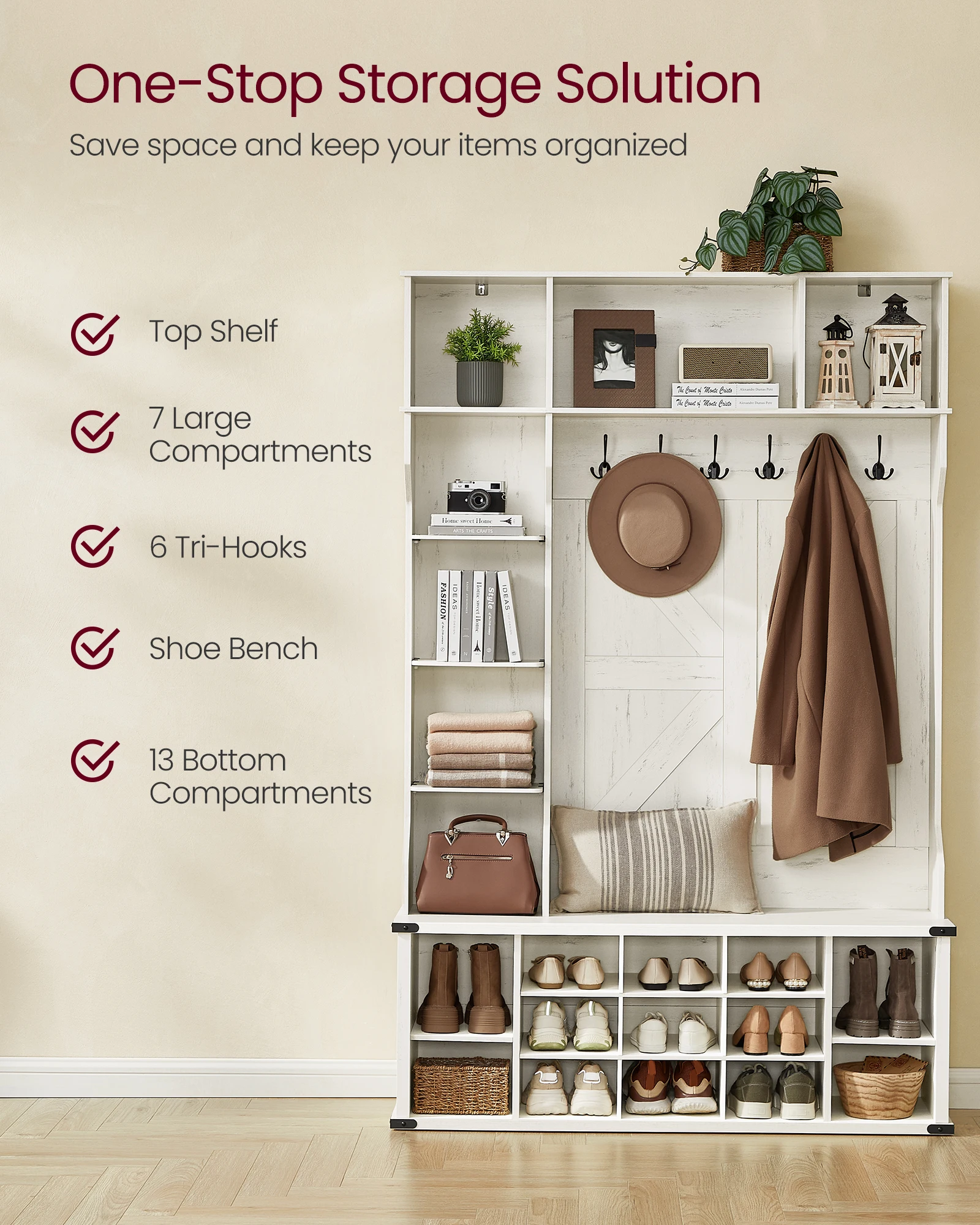 This Multifunctional 4-in-1 Design the versatile hall tree combines 6 tri-hooks, 7 large compartments, 13 small compartments for shoes, and a bench to optimize your space with Adaptable Shoe Storage